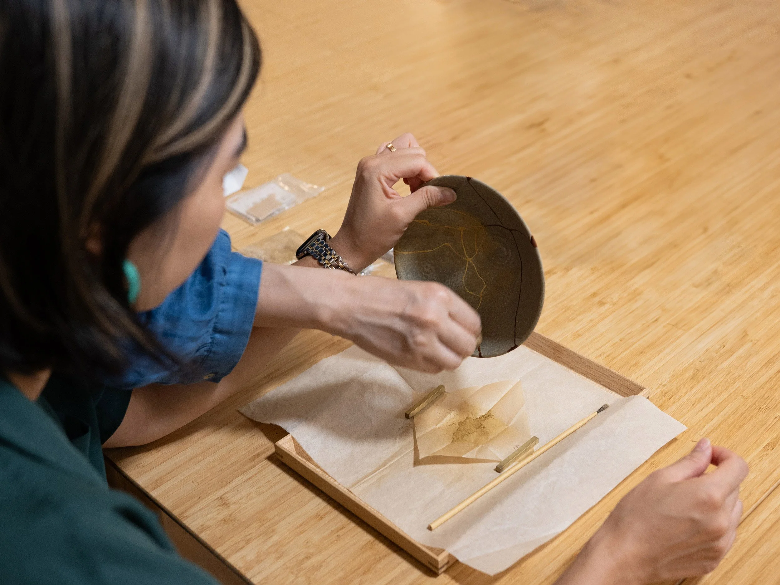 Because kintsugi is a slow process that requires time for layers of lacquer to cure, repairs on your own piece cannot be completed in a single session. You’ll be introduced to the first step, and may continue in a follow-up course if you wish to finish the repair.